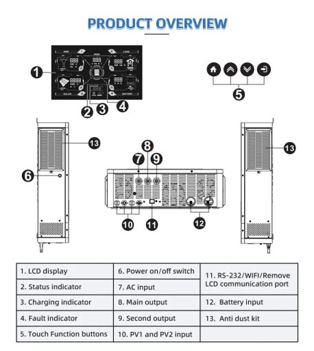 Jest to wielofunkcyjny falownik/ładowarka, łączy funkcje falownika, ładowarka solarna i ładowarka do akumulatorów, aby zaoferować zasilanie gwarantowane z przy niewielkich rozmiarach urządzeń. Jego wszechstronny wyświetlacz LCD oferuje konfigurowalne i łatwo dostępne funkcje pracy, takie jak prąd ładowania baterii, AC/ładowarka solarna priorytet i dopuszczalne napięcie wejściowe w oparciu o różne schematy pracy.