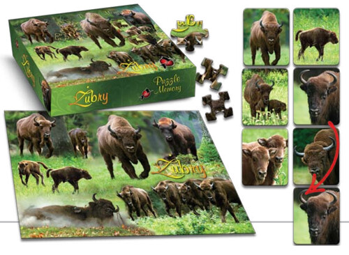 Pudełko zawiera grę memory oraz układankę typu puzzle.