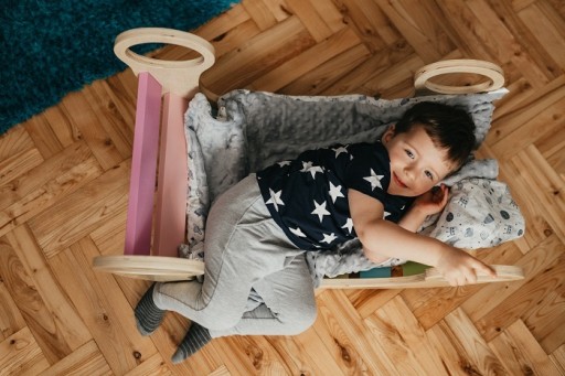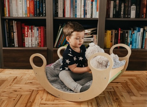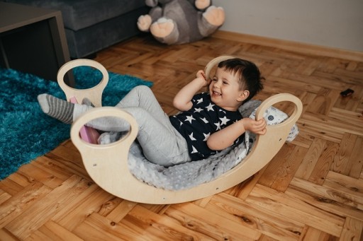 - Niemowlak - jeśli wnętrze bujaka wyłożysz miękkim materiałem, możesz chwilę pokołysać w nim niemowlę. Po ustawieniu bujaka w formie mostu i zawieszeniu na nim zabawki dziecko uczy się łączyć rączki w linii środkowej ciała, otwierać rączki aby chwycić zabawkę.