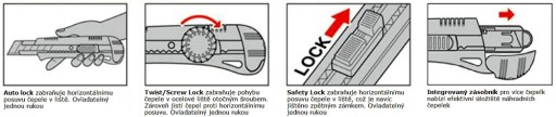 Nowa konstrukcja łączy w sobie zalety elastomerowej rękojeści typu Comfort Grip i automatycznej blokady ostrza AutoLock dając w efekcie narzędzie o szczególnych cechach ułatwiających pracę - odporność na działanie kwasów, olejów i rozpuszczalników /w tym również acetonu/, automatyczną blokadę ostrza w suwaku, antypoślizgową rękojeść wykonaną z kompozytu wypełnionego włóknem szklanym oraz wyjmowaną końcówkę do bezpiecznego odłamywania zużytego segmentu ostrza.