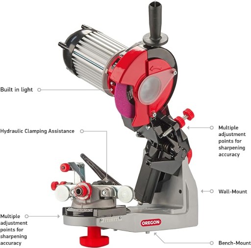 Szlifierka do ostrzenia łańcuchów tnących marki Oregon, lidera wśród producentów profesjonalnych układów tnących, to gwarancja zawsze idealnie naostrzonych łańcuchów. Automatyczny zacisk imadła wspomagany niezawodnym układem hydraulicznym skraca czas ostrzenia łańcucha do 50%. Ponadto możliwość regulacji trzech kątów i grubości rowka imadła sprawiają, że szlifierka Oregon jest uniwersalnym narzędziem pozwalającym ostrzyć łańcuchy tnące każdego producenta bez względu na ich parametry techniczne. Montowane we włoskich fabrykach przez profesjonalnych pracowników szlifierki Oregon cieszą się w opinii użytkowników wysoką niezawodnością, wygodą oraz ponadprzeciętną żywotnością.