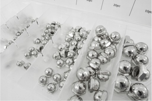 Zestaw 150 sztuk nakrętek metrycznych kołpakowych/zamkniętych. Zestaw zawiera rozmiary M3, M4, M5, M6, M8, M10. Całość umieszczono w wygodnym opakowaniu typu "sortownik".