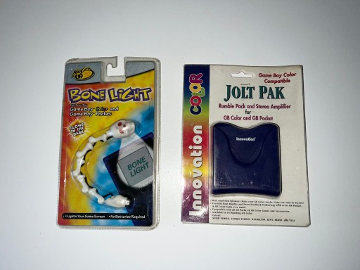 Sprzedaję zestaw: unikatowe akcesoria do konsol NINTENDO Game Boy Color / Pocket lampka z obudową fluorescencyjną Bone Light firmy MadCatz + adapter z wibracją i głośnikiem stereo Jolt Pack firmy Innovation.