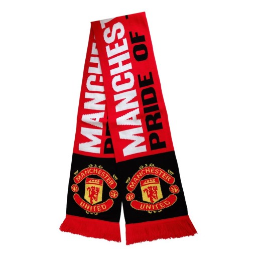 Dwustronny szalik dziany z herbem klubu Manchester United.