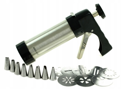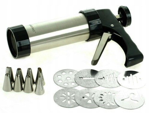 Maszynka do ciastek to sprawdzone i niezawodne urządzenie, które przyśpieszy wyrób domowych ciastek. Solidne materiały i staranne wykonanie szprycy gwarantują użytkowania przez lata. \nMaszynka do ciastek posiada 8 wzorów ciastek oraz możliwość regulowania ich grubości. Dzięki odpowiednio zaprojektowanemu tłokowi ciasto jest w całości przesuwane w cylindrze wyciskarki do ciastek co niweluje problem zapychania się dyszy. W zestawie otrzymasz także 8 dysz, które służą do dekorowania ciastek, ciast i tortów. Maszynkę można rozłożyć i dokładnie umyć. \nCechy: \n\nStalowe tłoczysko\nABS dźwignia\nRegulowana grubość ciastek\n8 tarcz do ciastek\n8 dysz do dekorowania\nŁatwe czyszczenie\nPrzesuwa ciasto przez cylinder w całości, bez zapychania\nŁatwe trzymanie i kontrolowanie wyciskacza\nWymiar 22 x 14 cm\n