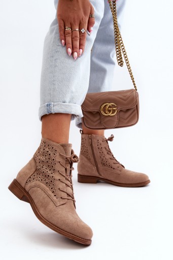 Botki damskie wykonane z eko zamszu. Ażurowa cholewka ozdobiona kwiatami. Osadzone na płaskim obcasie. Zapinane na suwak z boku oraz dodatkowo posiadają sznurowanie, co umożliwi lepsze dopasowanie. Noski zaokrąglone. Dodatkowo model ten posiada usztywniony zapiętek. Przy wyborze rozmiaru prosimy sugerować się tabelą rozmiarów.