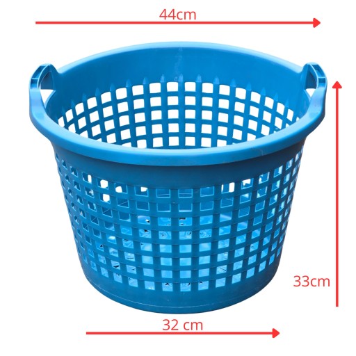 Kosz wykonany z mocnego, wytrzymałego tworzywa w ładnym niebieskim kolorze. Posiada wzmocnione dno i jest wyposażony w szerokie i wygodne uchwyty. Ażurowa konstrukcja sprawia, że gromadzone w nim przedmioty mają dostęp powietrza.