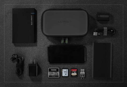 Etui firmy UGREEN, w którym zmieścimy dysk twardy SSD, a także różne akcesoria, takie jak: ładowarka sieciowa, kabel USB, pendrive, karty pamięci, adaptery, itp. Wykonane z trwałego materiału EVA. Jest wodoodporne i kompaktowych rozmiarów, co sprawia, że możemy je zabrać w każdą podróż.