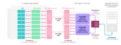 Obudowa dyskowa JBOD TL-D800S umożliwia tworzenie kopii zapasowych i rozbudowę systemu QNAP NAS, komputerów z systemem Windows® i Ubuntu® oraz serwerów. Model TL-D800S jest wyposażony w osiem 3,5-calowych zatok dyskowaych SATA 6 Gb/s, i oferuje kartę QXP PCIe do podłączania obudowy przy użyciu kabla SFF-8088 (lub SFF-8644). Zapewnia niezawodną wydajność odczytu/zapisu, umożliwiając płynne działanie pamięci masowej i tworzenie kopii zapasowych.