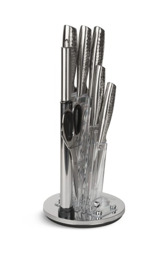 Zestaw 5 noży ze stali nierdzewnej z ostrzałką oraz nożycami w obrotowym stojaku.