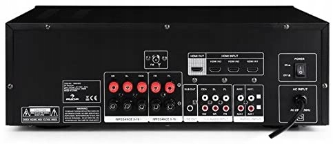 - złącza: 2 x wejście na mikrofon jack 6,3mm, 3 x wejście HDMI, 1 x wyjście HDMI, 2 x wejście liniowe cinch (RCA), 1 x komplet wejść 5.1 cinch (RCA), 1 x wyjście na subwoofer cinch (RCA), 1 x wejście na antenę FM