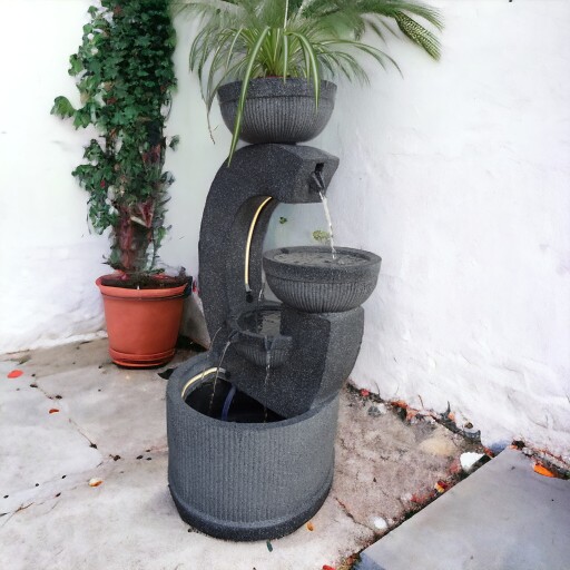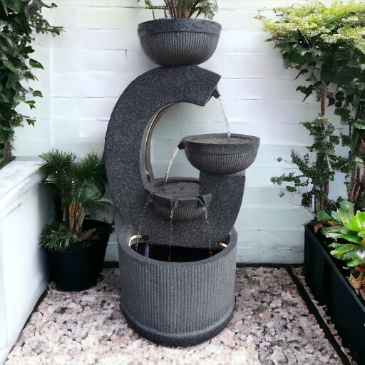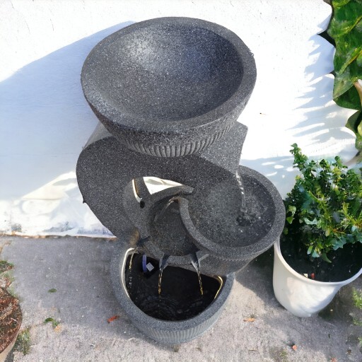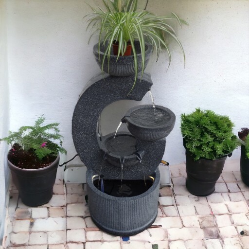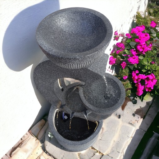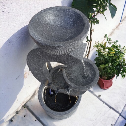 Fontanna w obiegu zamkniętym, woda w dolnym zbiorniku pompowana do górnego naczynia skąd kaskadowo – pod wpływem grawitacji spływa w dół …….. tu tego nie słychać ale jest to miłe i przyjemne doznanie zamykające oczy – można odczuć wrażenie przebywania blisko naturalnego strumienia ,