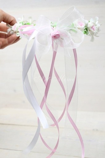 Niezwykle uroczy wianek komunijny, wykonany z biało różowych kwiatów i białych pąków róży , zdobiony delikatnymi kwiatuszkami maciejki w odcieniu liliowym, listkami bluszczu oraz kuleczkami krzewinki.
