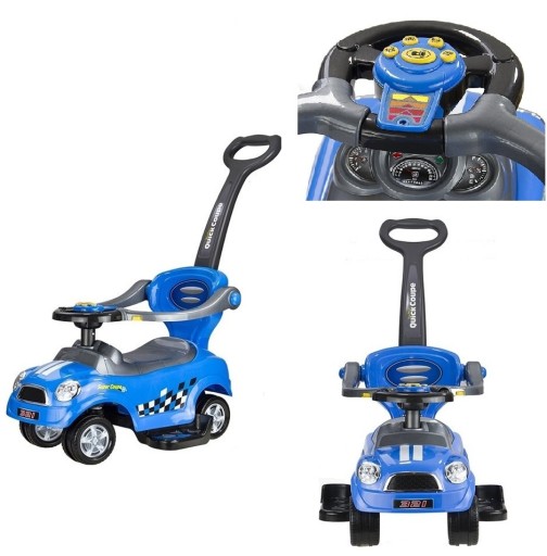 Istotną zaletą jeździka dziecięcego są muzyczne przyciski i dźwięki, które aktywowane są z kierownicy. Każdy z pięciu przycisków ukrywa coś specjalnego, co na pewno spodoba się dziecku, urozmaicając tym jazdę. Z czasem, kiedy maluch nabędzie nowe umiejętności, można w prosty sposób zdemontować barierkę ochronną i prowadnik dla rodzica, co pozwoli na samodzielną zabawę malca w domu, na podwórku czy w ogrodzie, dzięki czemu dziecko odkryje zupełnie inny wymiar zabawy. Pamiętaj, że już od pierwszych miesięcy życia maluszka warto zaszczepiać w nim uwielbienie do aktywności fizycznej, która jest świetnym sposobem na wspomaganie prawidłowego rozwoju — a niebieski coupe idealnie się do tego nadaje.