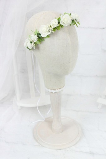 Piękny i wyjątkowy wianek komunijny, wykonany z kwiatów różyczek w odcieniu ciepłej bieli oraz eleganckich zielonych dodatków traw, idealnie wpisujących się w obecne trendy.