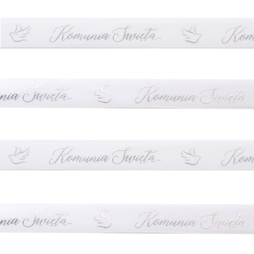 Elegancka satynowa wstążka z finezyjnym napisem Komunia Święta i z gołąbkami. Może posłużyć do dekoracji wielu elementów w tym prezentów, stołu komunijnego czy krzeseł.