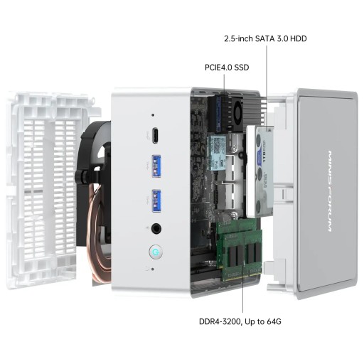 Mini PC posiada dwa gniazda pamięci DDR4 SO-DIMM obsługujące maksymalnie do 64 GB pamięci DDR4-3200.