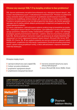 To trzecie, poprawione i zaktualizowane wydanie praktycznego przewodnika po języku SQL i relacyjnych bazach danych. Przemyślana, uporządkowana struktura podręcznika sprzyja sprawnemu nabywaniu wiedzy i doskonaleniu umiejętności - pracę z nim ułatwiają przystępny sposób prezentowania materiału i czytelne, łatwe do zrozumienia przykłady kodu SQL. Bardzo przydatnym elementem książki są odniesienia do składni (dialektów SQL) stosowanych w trzech najpowszechniejszych bazach danych: Microsoft SQL Server 2019, MySQL 8.0 i Oracle 18c. W tym wydaniu pojawiło się szersze omówienie typowych zadań analitycznych, uzupełniono też informacje o zastosowaniu Excela do wizualnej prezentacji danych, opisano więcej przydatnych funkcji, a także zaktualizowano i ulepszono dodatkowe materiały edukacyjne.