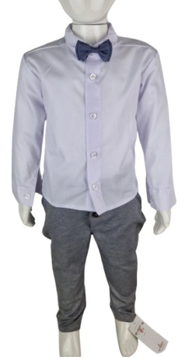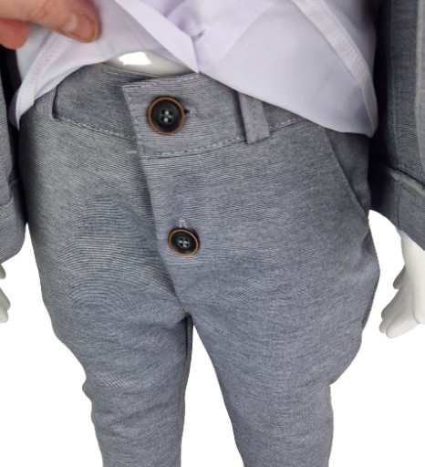 Spodnie są dopasowane, ale jednocześnie zapewniają swobodę ruchów, co jest ważne dla aktywnych chłopców. Zapięcie na guziki ułatwiają ubieranie i zdejmowanie spodni. Całość tworzy harmonijny zestaw, który doskonale sprawdzi się zarówno na uroczystościach, jak i podczas rodzinnych spotkań czy innych formalnych okazji, dodając małemu dżentelmenowi niepowtarzalnego wdzięku i stylu.