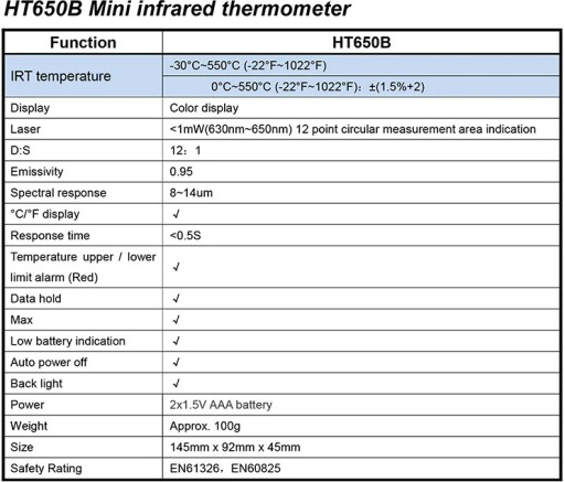 Bezkontaktowy termometr na podczerwień HT650B zapewnia precyzyjny i szybki pomiar - wyniki uzyskasz w mniej niż 0,5 s. Prosty w obsłudze i poręczny - używanie go nie sprawi Ci żadnego problemu. Urządzenie zostało wyposażone w alarm limitu temperatury oraz kolorowy wyświetlacz LCD. Sprawdzi się w wielu zastosowaniach. Do jego zasilania niezbędne są 2 baterie AAA 1,5 V.