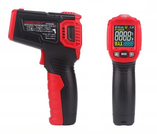 Termometr na podczerwień HT650B umożliwia bezdotykowe dokonywanie pomiarów w zakresie -50°C-550°C lub -58°F-1022°F. Jego obsługa jest bajecznie prosta - wystarczy skierować go w stronę wybranego obiektu i nacisnąć przycisk. 12 punktów pomiaru zapewnia wysoką precyzję.