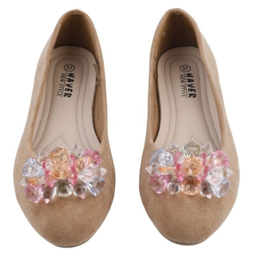 Balerinki damskie z klasyczną cholewką odsłaniającą kostkę. Na płaskiej podeszwie. Wsuwane, z zaokrąglonym noskiem. Wykonane z ekozamszu, wkładka z ekoskóry. Udekorowane na nosku kolorowymi szkiełkami. Balerinki te będą strzałem w dziesiątkę!