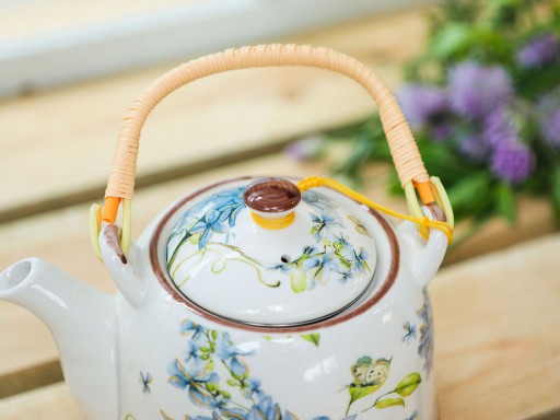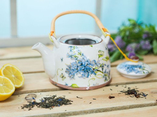 Uroczy, ceramiczny czajnik z zaparzaczem marki Carmani. Dzbanek z pokrywką o pojemności 800 ml. Czajnik jest koloru kremowego zdobiony kwiatowym wzorem niebieskich bzów. Imbryk wraz z przykrywką wykonany został z ceramiki, natomiast sitko wykonane zostało ze stali nierdzewnej. Przez zastosowanie filtra, fusy nie przedostają się do naczynia, a nasz napój jest klarowny i czysty. Dodatkowym atutem czajniczka jest jego wygodny i ozdobny uchwyt wykonany z tworzywa sztucznego, który idealnie komponuje się z całością. W zestawie znajduje się także sznureczek zabezpieczający przykrywkę.