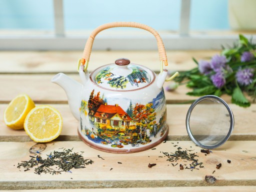 Uroczy, ceramiczny czajnik z zaparzaczem marki Carmani. Dzbanek z pokrywką o pojemności 800 ml. Czajnik jest koloru kremowego zdobiony dworkiem z kolekcji Village Life. Imbryk wraz z przykrywką wykonany został z ceramiki, natomiast sitko wykonane zostało ze stali nierdzewnej. Przez zastosowanie filtra, fusy nie przedostają się do naczynia, a nasz napój jest klarowny i czysty. Dodatkowym atutem czajniczka jest jego wygodny i ozdobny uchwyt wykonany z tworzywa sztucznego, który idealnie komponuje się z całością. W zestawie znajduje się także sznureczek zabezpieczający przykrywkę.