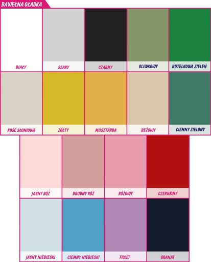 Ecru, Beżowy, Brązowy, Brudny róż, Jasny róż, Czarny, Miętowy, Błękitny, Jasny szary, Ciemny szary, Ciemny niebieski, Żółty, Pomarańczowy, Pistacjowy, Szmaragdowy