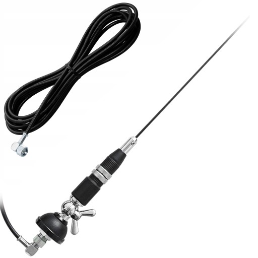 Antenę możemy zamontować na karoserii pojazdu. Długi 4m przewód umożliwia swobodne podłączenie anteny do radia CB w samochodzie. Przewód anteny jest zakończony najpopularniejszym złączem, jakie występuje w radiach CB.