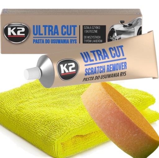 Zestaw do ręcznego usuwania rys z lakieru: Pasta K2 Ultra Cut + gąbka polerska + miękki ręcznik z mikrofibry.