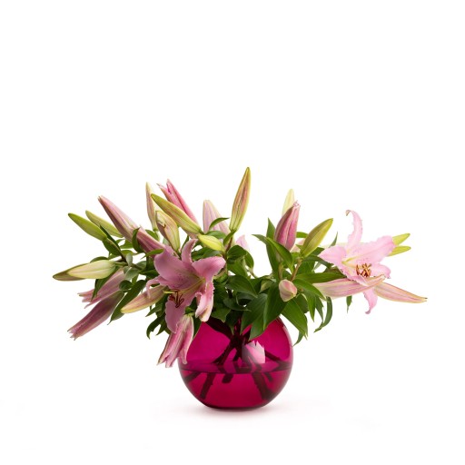 Jednak, mimo że wygląda on wyjątkowo efektownie samodzielnie, zachwyca również w roli naczynia do prezentacji kwiatów ciętych oraz efektownych bukietów. Kolorystyka wazonu idealnie współgra z delikatnymi kwiatami, takimi jak lilie w odcieniu jasnoróżowym.