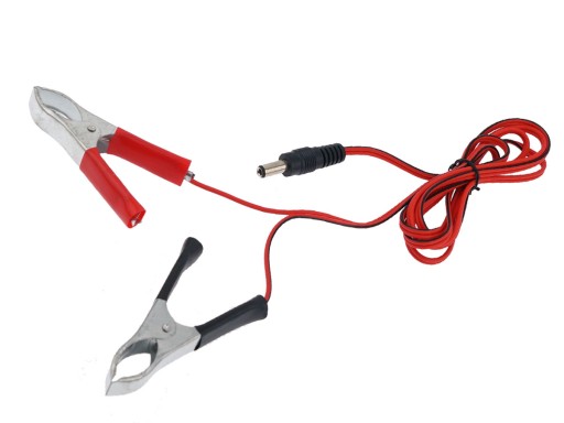 Dwużyłowy przewód elektryczny zakończony standardowym wtykiem DC 2,5/5,5mm, a z drugiej strony krokodylkami. Przewód o długości 120cm w czerwonym kolorze izolacji z dodatkowym rozróżnieniem żyły.