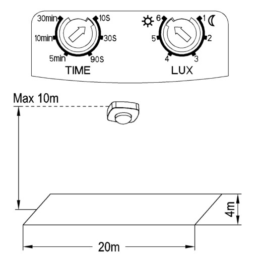 - LUX - Regulacji progu natężenia światła, przy którym czujnik ma załączać oświetlenie LUX: <3-2000 lux