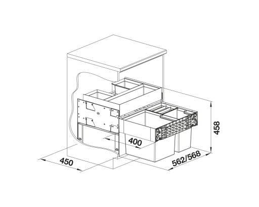 - Wysokość montażowa 456 mm (włożone pojemniki uniwersalne można w razie potrzeby przesunąć, aby zrobić miejsce np. dla armatury przelewowo-odpływowej), głębokość montażowa 400 mm, wymagane wymiary wewnętrzne szafki dla prowadnic 450 mm.