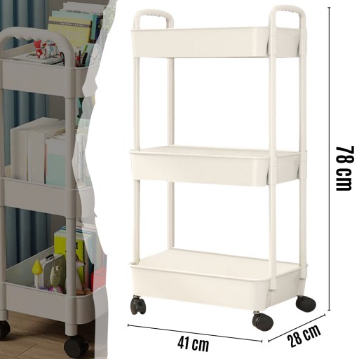 Uniwersalny regał idealnie nadający się do różnych pomieszczeń, takich jak kuchnia, łazienka, salon lub sypialnia, pozwala na zagospodarowanie wąskiej przestrzeni i ułatwia dostęp do potrzebnych przedmiotów. Regał posiada trzy półki, które pomieszczą wiele różnych akcesoriów, a także cztery kółka, z których dwa są blokowane hamulcem. W zestawie znajdują się również pięć haczyków, które mogą być zamontowane po lewej lub po prawej stronie na dowolnym poziomie.