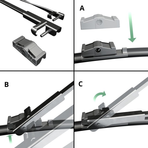 - pakiet adapterów: adaptery służą do połączenia pióra wycieraczki z ramieniem wycieraczki danego modelu samochodu. W przypadku opisywanego zestawu należy zastosować adapter X3