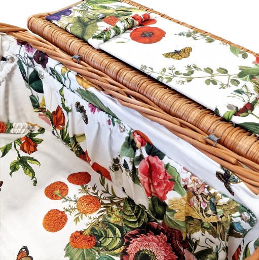 Jego elegancki design, wzbogacony obszyciem w kwieciste wzory, sprawia, że ten kosz jest nie tylko funkcjonalny, ale również estetyczny. To idealne rozwiązanie dla osób ceniących sobie wyjątkowe detale i staranność wykonania.