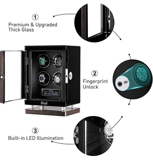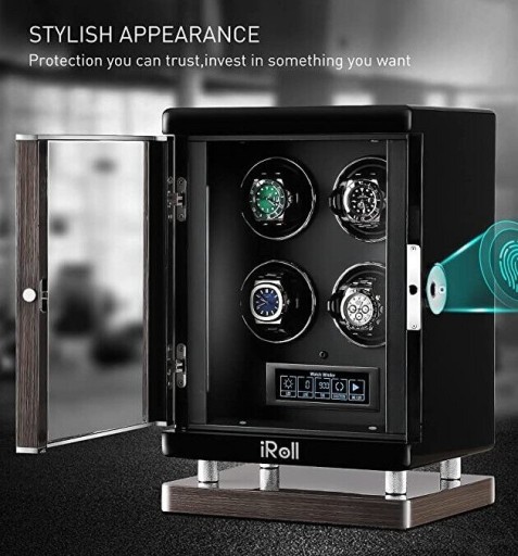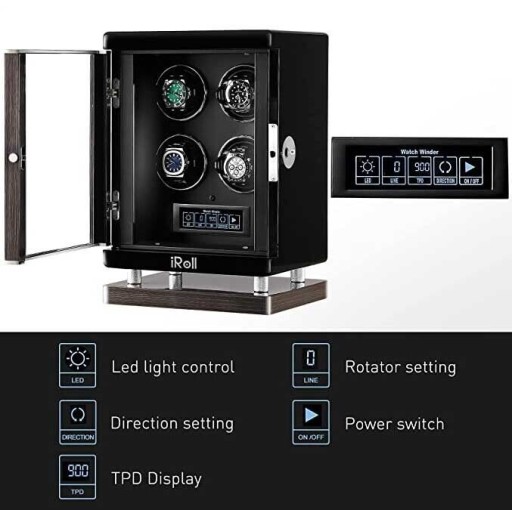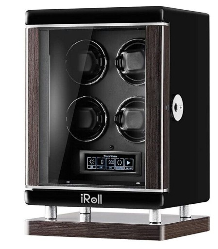 Ręcznie wykonany ekskluzywny Rotomat zegarków iRoll Roma ma 4 miejsca na zegarki, które zapewniają maksymalną elastyczność, kompaktową i wyrafinowaną konstrukcję eliminującą tarcie między zegarkami. Z wyjątkowo cichymi japońskimi silnikami + elastycznymi poduszkami + oświetleniem LED + ekranem LCD + pilotem