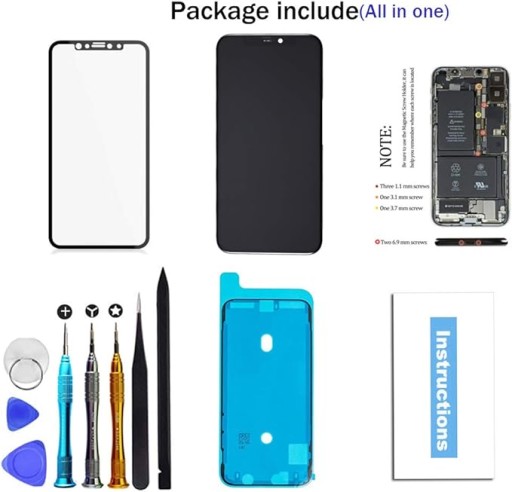 - Lista pakietów: 1 * Wyświetlacz dla iPhone'a XS MAX, 1 * Podkładka pod, 1 * Zestaw narzędzi naprawczych, 1 * Wodoodporna uszczelka, 1 * Osłona ekranu.