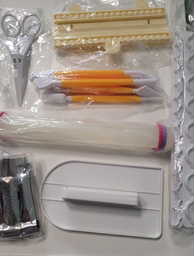 W zestawie również: 8 ołówków do modelowania, 1 prostownica, 1 wałek,1 nożyczki, 2 zaciskarki ząbkowane, 4 listwy do bordiur, 1 forma do koralików cukrowych.
