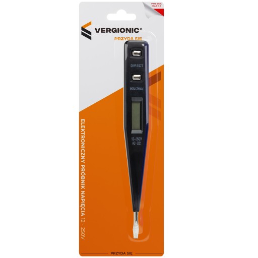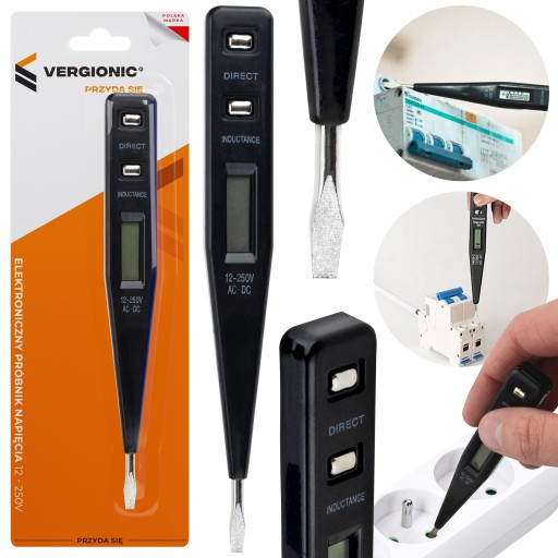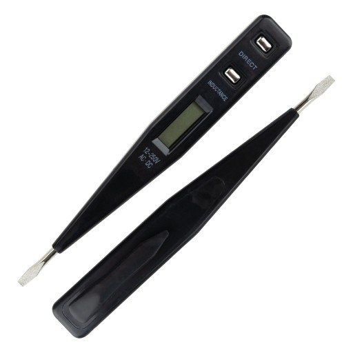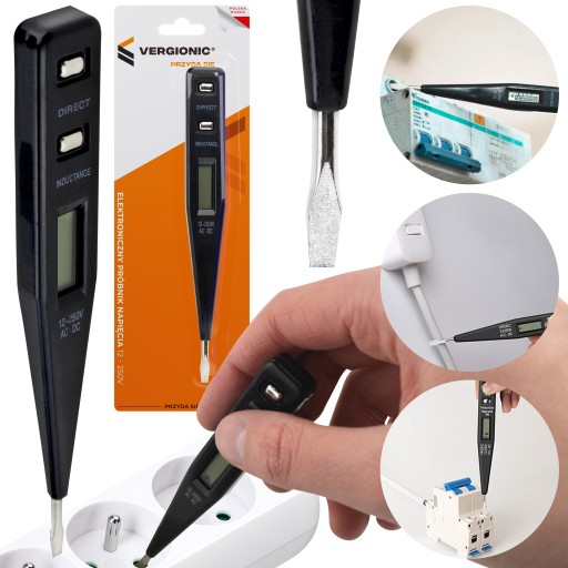 Na wyświetlaczu pojawi się wtedy błyskawica oraz wartość napięcia. Metoda indukcyjna umożliwia wykrycie napięcia po przyłożeniu do izolowanego przewodu – wtedy na wyświetlaczu pojawi się symbol błyskawicy. Próbnik pozwala na mierzenie prądu AC i DC o napięciu od 12V do 250V.