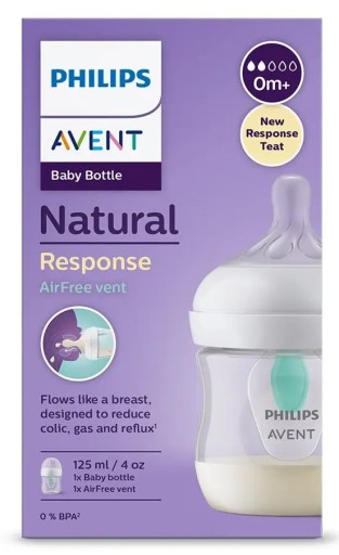 Smoczek z regulacją przepływu (2 prędkości) Naturalne przysysanie dzięki smoczkowi w kształcie sutka Szeroki, miękki i elastyczny smoczek naśladuje kształtem i fakturą kobiecą pierś, pomagając dziecku przyssać się i spokojnie pić. Smoczek umożliwia wypływanie mleka tylko w momencie aktywnego ssania przez niemowlę. Smoczek Natural Response wspiera naturalny rytm karmienia niemowlęcia, ułatwiając łączenie karmienia piersią i butelką. Smoczek wyposażony jest w unikatowy otwór, który powoduje wypływanie mleka wyłącznie w momencie aktywnego ssania przez niemowlę. Dzięki temu gdy dziecko przestaje ssać, aby nabrać powietrza, mleko również przestaje płynąć. Zaprojektowana z myślą o ograniczeniu problemów związanych z karmieniem Nakładka antykolkowa AirFree, która zapobiega przedostawaniu się powietrza do małego brzuszka w trakcie karmienia w ułożeniu pionowym, zapewnia dodatkową ochronę przed problemami związanymi z karmieniem. Wybierz odpowiednią prędkość wypływania pokarmu dla swojego dziecka Każde dziecko je w inny sposób i w swoim własnym tempie. Projektując smoczek, uwzględniliśmy różne prędkości wypływania pokarmu, dzięki czemu można z powodzeniem znaleźć tę idealnie dopasowaną do potrzeb dziecka i dostosować butelkę do jego indywidualnych wymagań. Wszystkie smoczki Natural Response wykonano z miękkiego silikonu. Specjalna budowa smoczka zapobiegająca kapaniu chroni przed rozlewaniem się mleka Otwór smoczka został skonstruowany tak, aby mleko wypływało tylko wtedy, gdy dziecko ssie. Dzięki temu można mieć pewność, że mleko nigdzie się nie rozleje. Zgodność z innymi produktami Philips Avent Laktator, butelkę i elementy kubeczka można ze sobą dowolnie łączyć, aby stworzyć produkt idealnie dopasowany do potrzeb. Łatwa do trzymania, nawet przez malutkie rączki Ergonomiczną butelkę łatwo się trzyma pod dowolnym kątem, co zapewnia maksymalny komfort podczas karmienia. To wygoda zarówno dla dorosłych rąk, jak i malutkich rączek niemowlęcia. Łatwe używanie, mycie i składanie Szeroka szyjka butelki ułatwia jej napełnanie i mycie. Zawiera zaledwie kilka elementów, dzięki czemu można ją szybko i łatwo złożyć. Na przykład nakładka antykolkowa AirFree to tylko jeden element. Smoczki i butelki Natural Response nie zawierają bisfenolu A* Butelki i smoczki Philips Avent Natural zostały wykonane z materiału niezawierającego bisfenolu A*. Poczekaj cierpliwie — dziecko musi się przyzwyczaić Nasze nowe butelki dla niemowląt Natural Response różnią się od butelek charakteryzujących się swobodnym wypływaniem pokarmu. Podobnie jak w przypadku karmienia piersią, przyzwyczajenie się do picia z tej butelki może wymagać kilku prób, co jest w pełni naturalne. Zawartość zestawu 1 szt. Smoczek z regulacją przepływu (2 prędkości) 1 szt.Butelka dla niemowląt 125 ml