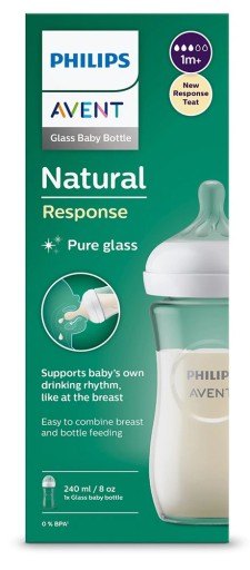 Wsparcie naturalnego rytmu ssania niemowlęcia Smoczek imitujący pierś Smoczek Natural Response umożliwia wypływanie mleka tylko w momencie aktywnego ssania przez niemowlę. Niemowlę pije, połyka i oddycha całkowicie naturalnie, tak samo jakby ssało pierś. Smoczek ułatwia łączenie karmienia naturalnego i butelką. Łatwe łączenie karmienia piersią i butelką Naturalne przysysanie dzięki smoczkowi w kształcie sutka Smoczek umożliwia wypływanie mleka tylko w momencie aktywnego ssania przez niemowlę. Inne zalety Wybierz odpowiednią prędkość wypływania pokarmu dla swojego dziecka Specjalna budowa smoczka zapobiegająca kapaniu chroni przed rozlewaniem się mleka Łatwe używanie, mycie i składanie Smoczki i butelki Natural Response nie zawierają bisfenolu A* Szkło klasy farmaceutycznej o wysokiej czystości i odporności na wysokie temperatury Poczekaj cierpliwie — dziecko musi się przyzwyczaić Nakładka antykolkowa nie pozwala powietrzu trafiać do brzuszka Zaprojektowana, aby ograniczać kolkę i dyskomfort Dane techniczne Zawartość zestawu Butelka dla niemowląt 240 ml: 1 pcs