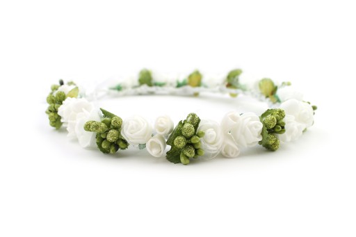 Wianek komunijny w odcieniach bieli i brokatowej zieleni. Wykonany ręcznie, z piankowych kwiatów doskonale imitujących kwiaty żywe. Regulowany satynowymi wstążeczkami, obwód 50cm. Delikatny, wysokość róż ok.2cm
