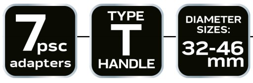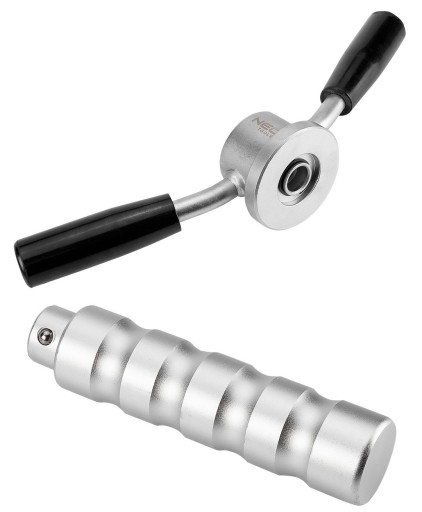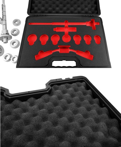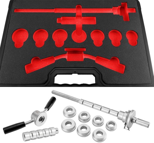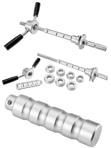 Komplet pozwala na prosty i szybki montaż bez obawy o uszkodzenie łożysk czy belki osi. Kompatybilny jest z większością łożysk. Składa się na 7 sztuk stalowych adapterów o średnicach od 32 do 46 mm, uchwytu typu T i prowadnicę. Elementy przechowywane są w walizce z miękką gąbką, ułatwiającą konserwację i transportowanie kompletu.