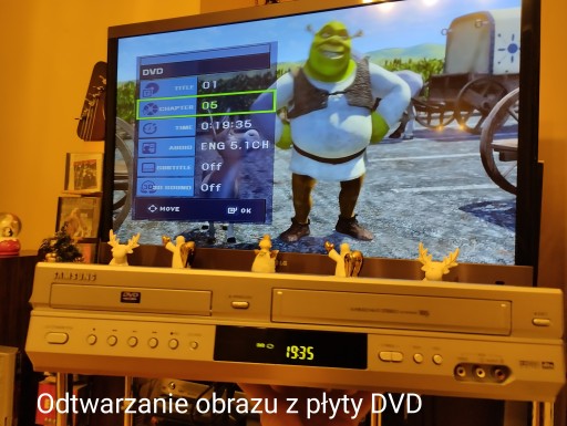 Maszyna technicznie w bardzo dobrym stanie, na ostatnich zdjęciach widać jaki generuje świetny obraz i soczyste kolory z kaset VHS a odtwarzacz DVD również ideał.