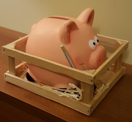 Klasyczna świnka skarbonka umieszczona w zagrodzie z siankiem. Do świnki dołączony jest młoteczek. Ładny element dekoracyjny pokoju i dobry sposób na oszczędzanie.