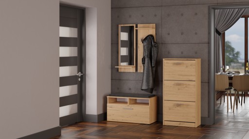 - Pojemna szafka na buty wykonana jest z wytrzymałej płyty laminowanej, która jest odporna na ścieranie, zapewniając długotrwałą użyteczność.