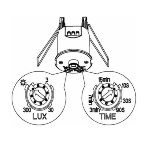 - LUX - Regulacji progu natężenia światła, przy którym czujnik ma załączać oświetlenie LUX: <3-2000 lux
